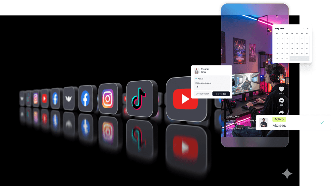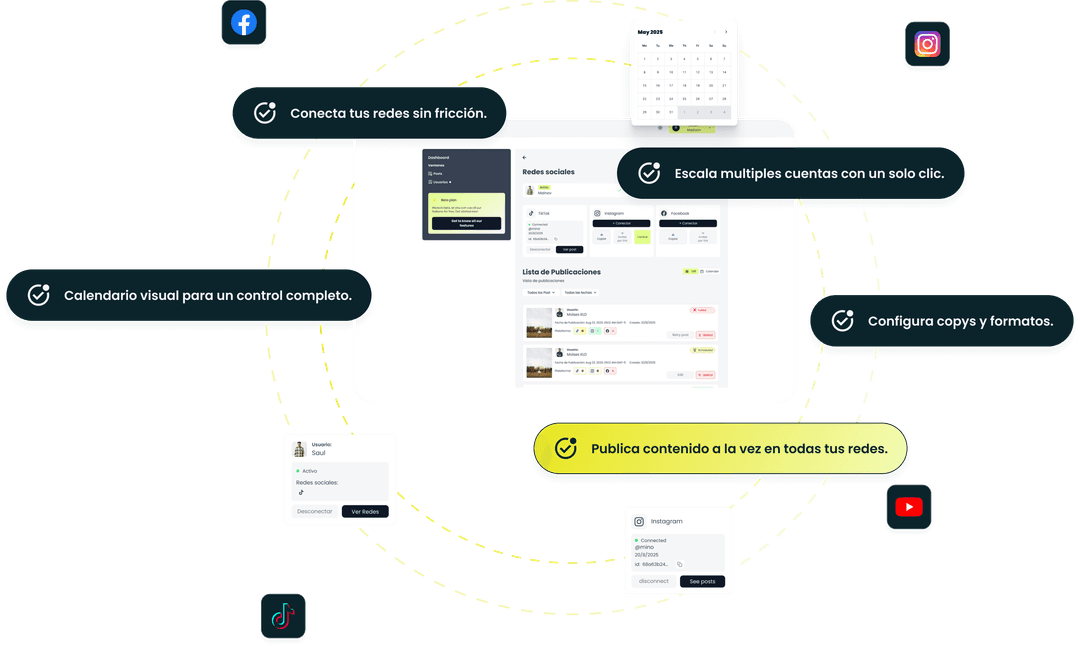 Un solo dashboard para crear, adaptar y publicar en varias cuentas. Calendario, edición y control total, sin complicaciones.